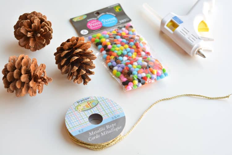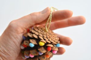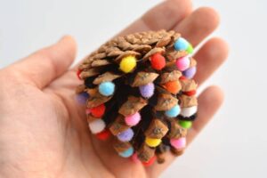Προετοιμασία: Βεβαιωθείτε ότι τα κουκουνάρια σας είναι καθαρά και στεγνά. Τα μικροσκοπικά πον πον είναι τέλεια για να ταιριάξουν στα μικρά “λέπια” του κουκουναριού.
