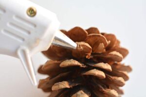 Βάλτε λίγη θερμή κόλλα κάτω από κάθε “λέπι” του κουκουναριού.